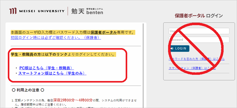 また明星大学学生・教職員の皆様はログイン画面左側のリンク(下図赤枠)よりログインしてください。